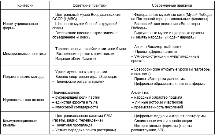 Рис. 1. Структура традиции воспитания Советская традиция воспитания дала отечественному образованию значительное число эффективных педагогических практик, прошедших проверку временем. Особое место среди них занимает воспитание на основе памяти о ВОВ, обеспечивающее передачу патриотических идеалов между поколениями. Советский опыт формирования исторической памяти о войне не исчез в постсоветский период, но подвергся существенной трансформации. Сохраняя преемственность с прежними формами, современные практики адаптируются к новым социокультурным условиям, цифровой среде и изменившейся системе ценностей. Сравнительный анализ (Таблица 1) показывает, что основные направления сохранения исторической памяти (институциональные, мемориальные, педагогические, идеологические и коммуникативные) сохраняют преемственность с советским опытом, но приобретают новые формы. Таблица 1 Сравнительный анализ советских и современных практик сохранения исторической памяти о Великой Отечественной войне