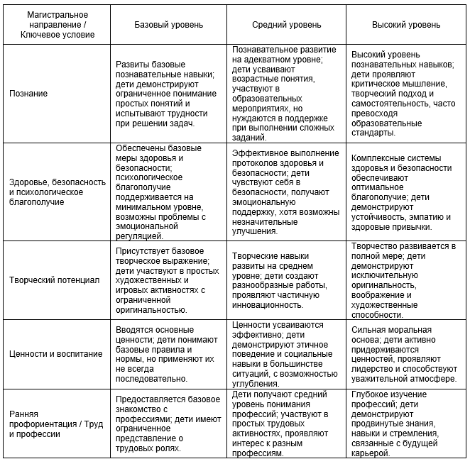 Система самодиагностики ДОО включает критерии и показатели, учитывающие специфику общеразвивающей, компенсирующей, оздоровительной, комбинированной направленностей, а также разновозрастных и групп детей раннего возраста. Общеразвивающие группы ориентированы на реализацию базовой программы дошкольного образования, компенсирующие — на адаптированные программы для детей с ограниченными возможностями здоровья с учетом их психофизических особенностей и потребностей, обеспечивающие коррекцию и социальную адаптацию. Оздоровительные группы предназначены для детей с хроническими заболеваниями, где наряду с образовательной программой реализуется комплекс лечебно-оздоровительных мероприятий. Комбинированные группы объединяют здоровых детей и детей с ОВЗ в условиях адаптированной образовательной среды. Разновозрастные группы включают воспитанников разного возраста, а группы раннего возраста обеспечивают присмотр и развитие детей от 2 месяцев до 3 лет без реализации формальной образовательной программы. Разработанная система самодиагностики направлена на комплексную оценку качества образовательного процесса и выявление направлений для совершенствования деятельности ДОО. В ходе апробации, проведённой на базе 150 дошкольных организаций Челябинской области различных типов, были проанализированы ключевые аспекты функционирования учреждений, а результаты представлены в процентном выражении. Полученные данные самодиагностики способствуют объективной оценке эффективности реализации образовательных программ и комплексного сопровождения воспитанников с учётом специфики каждой группы, что обеспечивает основу для принятия управленческих решений и повышения качества дошкольного образования. Таблица 2 Результаты самодиагностики ДОО по ключевым категориям (показатели высокого уровня)