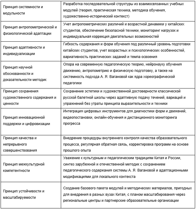 Исследование проводилось в течение одного учебного года: в нем принимали участие 28 педагогов-хореографов, случайным образом распределённых на контрольную и экспериментальную группы по 14 человек. Каждая группа в среднем вела занятия с 10-15 студентами, что позволило собрать данные по 240 студентам к концу эксперимента. В качестве основных инструментов были использованы шкала профессиональных компетенций и оценка технического мастерства студентов, дополнительно фиксировались антропометрические показатели студентов (рост, длина бедра, индекс длины ноги к росту) и показатель прыжка как объективный индикатор силовой и координационной динамики. Полученные данные свидетельствуют о том, что внедрение компонентов модульной программы привело к статистически значимому улучшению как профессиональной компетентности преподавателей, так и технического мастерства студентов в экспериментальных группах по сравнению с контрольной. Объективный показатель прыжка также показал улучшение в экспериментальных классах, сопоставимое с улучшением координационно-силовых показателей при целенаправленной работе по технике. Результаты исследования имеют практическое значение для проектирования учебных модулей при подготовке педагогов-хореографов: они позволяют учитывать морфологические особенности обучающихся при подборе упражнений и определении индивидуальных стратегий развития техники. Вместе с тем обнаружена вариативность результатов, частично обусловленная антропометрией и исходным уровнем подготовки, что требует дифференцированного включения опций модуля: в практико-ориентированных блоках следует предусматривать инструменты диагностики конституции и алгоритмы индивидуальной корректировки техники, а также системы контроля нагрузки. Исследование позволяет заключить, что внедрение компонентов системы А. Я. Вагановой в китайской среде достигает наилучших результатов при сочетании стандартов качества классической школы с гибкими, контекстно-адаптивными педагогическими инструментами, результатом чего становится значимое улучшение профессионального уровня педагогов-хореографов и, как следствие, устойчивая положительная динамика в технических показателях обучающихся. Это позволило выделить ряд принципов, обеспечивающих возможность внедрения модулей и программ в систему современного китайского образования (см. таблица 2). Таблица 2 Ключевые принципы внедрения модулей и программ в систему современного китайского образования