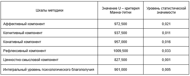 При рассмотрении полученных результатов можно заметить, что большая доля и студентов-первокурсников, и студентов выпускного курса оценивают уровень психологического благополучия как средний (по каждому компоненту в отдельности и в целом). Можно предположить, что среди оставшихся студенты-первокурсники более склонны оценивать свой уровень психологического благополучия как низкий, при этом выделяется ценностно-смысловой компонент – 44% студента-первокурсника так самоопределились. Однако предположение, что студенты первого курса СПО ниже оценивают уровень своего психологического благополучия, чем студенты выпускного курса, требует статистической проверки. Для оценки различий между группами студентов первого и выпускного курсов был применен U – критерий Манна-Уитни. Рассчитанные значения U – критерия приводятся в таблице 2. Таблица 2 Значения U – критерия Манна-Уитни и уровни статистической значимости
