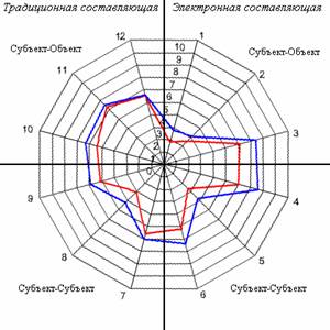 Рис.4. Круговая диаграмма степени сформированности компонентов информационной компетентности школьников контрольной группы (интегральные данные по всей выборке, 252 чел.) Красный цвет – 9-е классы, синий цвет – 11-е классы. Полученные результаты анкетирования позволяют утверждать следующее: 1. Спектр сформированности информационной компетентности старшеклассников, определяемый по предложенной методике, на качественном уровне устойчиво воспроизводится во всех четырех исследованных образовательных учреждениях. 2. Не наблюдается существенного прироста сформированности информационной компетентности в 11-м классе по сравнению с 9-м, что требует отдельного осмысления. 3. Заметна «зеркальная» симметрия сформированности «электронной» и «традиционной» составляющих информационной компетентности (за исключением умений пользоваться учебниками, энциклопедиями, словарями). Иными словами, это означает, что если учащийся умеет (не умеет) исполнять те или иные действия, то он, как правило, умеет (не умеет) исполнять их с применением как традиционных, так и электронных технологий. 4. Наименее развиты и не имеют динамики развития в старшей школе компоненты информационной компетентности: