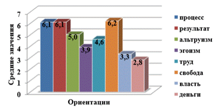 Нужно отметить, что профессиональная самоидентификация личности включает в себя понимание своей профессиональной деятельности, понимание себя в профессии, а также умение решать профессиональные задачи. Кроме того, профессиональная самоидентификация усиливается по мере накопления практического опыта в профессиональной деятельности, повышает уровень заинтересованности своим будущим трудом и способностью отождествлять себя в профессиональной роли специалиста. В настоящей работе «профессиональная самоидентификация личности» рассматривается как интегральное образование, включающее профессиональную картину мира, систему ценностей и менталитет той профессиональной группы, к которой принадлежит личность. Изучение вопроса профессиональной самоидентификации в виртуальной среде студентов на этапе обучения в вузе необходимо для выявления особенностей и специфики социально-профессиональной адаптации личности будущих специалистов. Самоидентификация личности с профессией тесно связана со структурой профессиональных представлений, которые могут выступать как психологические механизмы формирования образа будущей профессии и должны рассматриваться через ценностно-мотивационный компонент, специфику коммуникативной и профессиональной компетентности используемых в глобальной Интернет среде. Исследование проводилось на двух группах студентов психологов 1 и 2 курса Санкт-Петербургского политехнического университета и Российского государственного педагогического университета им. А.И. Герцена, общая численность составила 60 человек (жен). В качестве психодиагностического инструментария были использованы методика диагностики социально-психологических установок личности в мотивационно-потребностной сфере О.Ф. Потемкиной, авторская анкета опросник «Оценочная шкала представлений о будущей работе», модифицированный вариант методики незаконченных предложений «Профессиональная направленность личности в Интернет среде». Гипотеза исследования заключалась в том, что использование сети Интернет способствует развитию студентов в коммуникативном и профессиональном аспекте становления и формированию целостного образа представлений о будущей профессиональной деятельности. Исследование позволило выявить, что студенты очень хорошо ориентируются в различных направлениях своей профессиональной деятельности, представляют ее как интересную, творческую, имеющую большое значение для решения актуальных и значимых задач для общества и открывающую возможности для повышения профессиональных навыков и карьерного роста. На рис. 1 представлены данные средних значений социально-психологических установок студентов психологов в мотивационно-потребностной сфере, полученных в ходе исследования.
