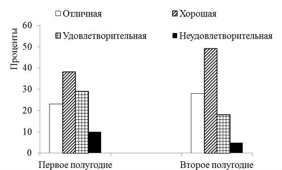 Рис. 1 Оценка готовности школьников к обеспечению безопасности в первом и втором полугодии учебного года Из данных, представленных на рисунке 1, видно, что во втором полугодии 28% школьников имели отличную готовность к обеспечению безопасности, 49% - хорошую, 18% - удовлетворительную и 5% - неудовлетворительную. Следовательно, проведенные мероприятия, направленные на повышение подготовленности школьников к действиям в опасных ситуациях, оказали положительное влияние. Повысилась мотивация учащихся к изучению предмета «Основы безопасности жизнедеятельности», отмечались позитивные изменения психологических показателей, регистрировалось возрастание физической работоспособности. В конце второго полугодия школьники также получили дипломы с указанием степени их готовности к обеспечению безопасности. Таким образом, проведенное исследование показало, что использование разработанного комплекса «Готов безопасность обеспечить» даёт возможность оценить подготовленность обучающихся к действиям в опасных ситуациях с учётом их знаний и умений в области безопасности жизнедеятельности, психологического статуса, физической работоспособности и устойчивости к гипоксии. Результаты исследования свидетельствуют о целесообразности применения данного комплекса в образовательном процессе.