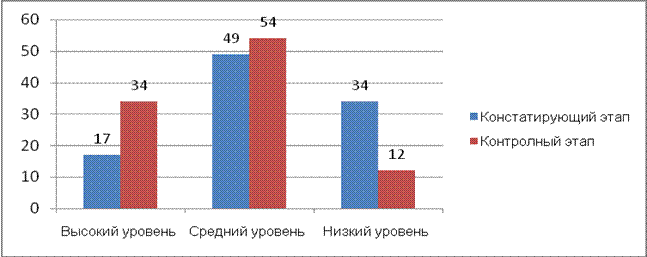 Рис.1. Результаты исследования уровня экологических знаний будущих педагогов по методике А.В. Усовой (констатирующий и контрольный этапы, %)