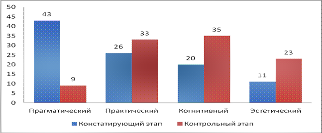 Рис.2. Результаты исследования ведущего типа мотивации взаимодействия по методике «Альтернатива» С.Д.Дерябо (констатирующий и контрольный этапы, %) Сравнительный анализ полученных результатов указывает на положительную динамику сформированности социально-экологической компетентности, что дает основание говорить о результативности комплекса проведенных мероприятий и участия будущих педагогов в них. Эта результативность была достигнута при соблюдении следующей совокупности условий: - организации учебно-воспитательного процесса с позиции: познания окружающей природы и функций самой природы, определения природы как самоценной системы жизни человека, осмысления будущими педагогами взаимодействия с природой как отношений в системе «субъект-субъект»; рассмотрения природы как универсального средства воспитания гуманистической направленности личности; - соблюдении принципа практикоориентированности в учебном процессе с максимальным использованием и анализом реальных экологических проблем и решением экологических задач; - участии будущих педагогов в социально-значимых проектах с социальной, экологической направленностью, научно-исследовательской деятельности, где они могут проявить индивидуальность, творчество при решении исследовательских задач и готовность к самореализации и др. - сотрудничестве, взаимоуважении, взаимном доверии преподавателей и студентов. В заключении отметим, что формирование социально-экологической компетентности составляет специфическую задачу подготовки будущих педагогов с учетом приоритетных направлений в области профессионального образования в вузе. Литература 1. Федеральный государственный образовательный стандарт высшего образования. Направление подготовки «Педагогическое образование» [Электронный ресурс]. (Утвержден Приказом Министерства образования и науки Российской Федерации от 4 декабря 2015г. № 1426). – URL: http://fgosvo.ru/uploadfiles/fgosvob/440301.pdf [дата обращения 30.11.18]. 2. Сикорская, Г.П. Ноогуманистическая модель эколого-педагогического образования [Текст]: Диссертация докт. пед. наук/ Г.П.Сикорская. – Екатеринбург, 1999. – 446 с. 3. Глазачев, С.Н. Экологическая культура [Текст] /С.Н. Глазачев, О.Н. Козлова. – Москва: Горизонт, 1997. – 208 с. 4. Захлебный А.Н., Дзятковская Е.Н., Грачев В.А. Концепция общего экологического образования в интересах устойчивого развития [Электронный ресурс]/ URL: http://docplayer.ru/33984614-Koncepciya-obshchego-ekologicheskogo-obrazovaniya-v-interesah-ustoychivogo-razvitiya.html [дата обращения 30.11.18]. 5. Моисеева, Л.В. Региональное экологическое образование: Теория и практика [Текст]: Диссертация доктора пед. наук/ Л.В. Моисеева. – Екатеринбург, 1997. – 376 с. 6. Перфилова, О.Е. Развитие социально-экологической компетентности педагога в профессиональном образовании [Текст]: Автореферат диссертации канд. пед. наук / О.Е. Перфилова. – Москва, 2007. – 29с. 7. Ермаков, Д.С. Формирование экологической компетентности учащихся [Текст] / Д.С. Ермакова. – Москва: МИОО, 2009. – 180 с. 8. Гагарин, А.В. Экологическая компетентность личности: психолого-акмеологическое исследование [Текст] /А.В. Гагарин. – Москва: РУДН, 2011. – 160 с. 9. Казакова, Н.Ф. Формирование компетенции старшеклассников в сфере экологического образования [Текст]: Диссертация канд. пед. наук /Н.Ф. Казакова. – Ижевск, 2004. – 185с. 10. Глазачев, С.Н. Становление гуманитарной технологии формирования экологиче