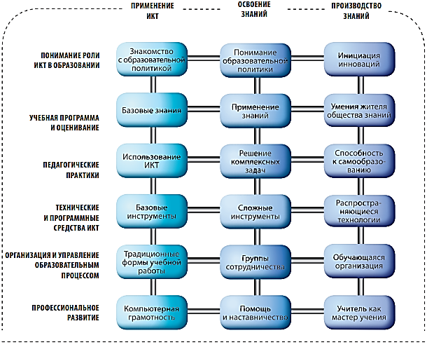 Рис. 1. Структура ИКТ-компетентности. Рекомендации Юнеско. 2011 г Обратимся к анализу понятия «цифровая грамотность». Впервые (в 1997 году) его ввел Пол Гилстер, американский писатель и журналист [6]. По мнению П.Гилстера, постоянное присутствие в Интернете, в поле гипертекста, дающего возможность быстрой навигации с одного ресурса на другой, формирует новые паттерны поведения человека, приемы поиска информации, особенности общения. Это приводит к формированию сетевого мышления, основная черта которого – высокая степень информационно-коммуникационной активности. П.Гилстер акцентирует социо-коммуникативные аспекты в деятельности человека и определяет цифровую грамотность как способность критически понимать и использовать информацию, получаемую посредством компьютера в различных форматах из широкого диапазона источников. В определении цифровой грамотности, предложенном Алланом Мартином включен социальный аспект и конкретизированы действия, выполняемые в интернете: осознание, установки и способность отдельных лиц надлежащим образом использовать цифровые инструменты и средства для идентификации, доступа, управления, интеграции, оценки, анализа и синтеза цифровых ресурсов, для построения систем новых знаний, а также общения с другими людьми с целью конструктивных социальных действий в контексте конкретных жизненных ситуаций [7, p. 19]. Таким образом, мы убеждаемся, что цифровая грамотность служит необходимым условием формирования цифровой компетентности пользователей. Это понятие рассматриваем в контексте перспектив развития цифровизации образования. В аналитическом отчете международной компании The Boston Consulting Group (BCG) «От кадров к талантам» представлена «Целевая модель компетенций 2025», компетенций, значимых для эффективного развития общественного устройства и экономики РФ. Данная модель включает три группы компетенций: социально-поведенческие, когнитивные и цифровые навыки [8, с. 20]. К цифровым навыкам, в данной модели, относятся: создание систем и управление информацией.