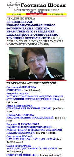 Виртуальная образовательная среда может быть в принципе организована либо в двумерном (2d) пространстве обычного интернета, либо в трехмерном (3d) виртуальном сетевом пространстве [2,3]. В двумерном пространстве организовать среду и проще и дешевле. К тому же в этом случае коммуницировать можно посредством смартфона, т.е. такая среда "всегда с собой", что немаловажно для современного человека. Примером организации обсуждаемой среды в двумерном пространстве может служить видеожурнал в формате экрана смартфона, где в верхней части первой страницы присутствует картинка-линк, ведущая к сетевой платформе (к примеру, Zoom), на которой осуществляется режим онлайн-коммуникации с записью коммуникативного события. Пример первой страницы такого журнала («Гостиная Штоля», http://stoll.spb.su) приведен на рис.1.