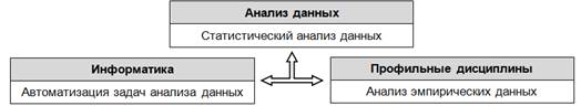 Рис. 1. Взаимосвязь предметных областей Считаем, что обучение АД, направленное на решение задач автоматизации статистического анализа эмпирических данных социальных исследований будет способствовать развитию профессиональной исследовательской компетенции студентов. В научно-методической литературе выделяют разные пути обогащения содержания частной методики преподавания дисциплины внесением элементов ИК: подбор многоуровневых компетентностно ориентированных заданий исследовательского характера; соотнесение практической цели формирования ИК целям изучения дисциплины; пересмотр содержания учебно-методического комплекса с точки зрения содержания ИК и другие [5]. Основным методическим приемом обучению АД, способствующим развитию профессиональной ИК был выбран «задачный подход», основанный на систематической работе студентов с комплексом задач, являющихся организующим стержнем данной работы. К задачам, используемым в процессе обучения АД, применялись следующие требования: соответствие профилю (аналогична некоторой классической задаче профильной дисциплины); возможность математического моделирования (содержательную часть можно перевести на математический язык и решить математическими методами); возможность автоматизации (решение поддается алгоритмизации и есть соответствующее программное обеспечение). Решение задач будет способствовать развитию ИК, если «процесс решения отражает логику фаз научного исследования» [9]. В качестве основного инструментария был выбран табличный процессор Microsoft Excel как доступное и уже знакомое студентам программное средство, не требующее затрат времени для первичного ознакомления. Статистический АД предполагает достаточный объем эмпирических данных. Данные могут быть получены из баз данных, которых в интернет достаточное количество. Но, данный прием не дает знания о методах их получения. Более целесообразным, с точки зрения развития профессиональной ИК, нам видится получение массива данных методом имитационного моделирования случайных процессов, с помощью генерации последовательностей псевдослучайных чисел с заданным законом распределения. Пример задания: для измерения показателя интеллекта учащихся психолог применил тест Равена. Осуществите имитационное моделирование результатов исследования с нормальным распределением. Для выполнения студенты должны изучить методику указанного теста, используемые шкалы, интервал возможных значений, интерпретацию результатов, что будет способствовать развитию знаний методических приемов изучения конкретного социального явления, которые необходимы еще на этапе подготовки социального исследования. На следующем этапе АД студенты осуществляют подготовку данных для последующего их анализа: сортировку, группировку, структурирование, визуализацию данных и прочее. Данный этап развивает умение структурировать информацию, которое ряд исследователей выделяют как показатель деятельностного компонента ИК. Далее студенты осуществляют статистический анализ полученных данных, заключающийся, в зависимости от темы, в вычислении статистических характеристик, проверке гипотез, проведении корреляционного, дисперсионного анализа. Анализ проводится средствами программной среды MS Excel. Использование готового программного обе
