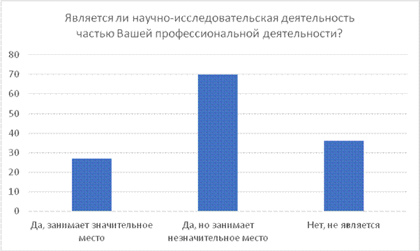 Рис. 4 Ответы респондентов на вопрос: «Является ли научно-исследовательская деятельность частью Вашей профессиональной деятельности?» Обнаружилась корреляция (на уровне Р=0,01) между ответами на вопрос: «Является ли научно-исследовательская деятельность частью Вашей профессиональной деятельности?» и ответами на вопросы: «Есть ли в Вашей образовательной организации «ученическая/студенческая наука»?», «В каком виде ученическая/студенческая наука» представлена в Вашей образовательной организации?», «В каких видах научно-исследовательской деятельности лично Вы участвовали/участвуете, уже занимаясь профессиональной деятельностью?». Респонденты, считающие научно-исследовательскую деятельность частью их профессиональной деятельности чаще отмечают, что защитили кандидатскую диссертацию, пишут статьи, участвуют в конференциях, принимают участие в организации проектной и исследовательской деятельности учащихся. Те же, кто не считает научно-исследовательскую деятельность частью своей профессиональной заметно чаще отмечают, что ученическая наука не представлена в образовательной организации. Отношение к научно-исследовательской деятельности не связано со стажем, с уровнем образования, с направлением профессиональной деятельности и с уровнем включенности в научно-исследовательскую деятельность в студенческие годы. Можно отметить, что если в школе ведется научно-исследовательская деятельность, то учителя статистически значимо (Р=0,001) отмечают, что они в ней участвуют и определяют научно-исследовательскую деятельность как часть своей профессиональной деятельности.