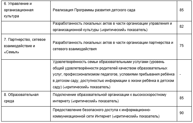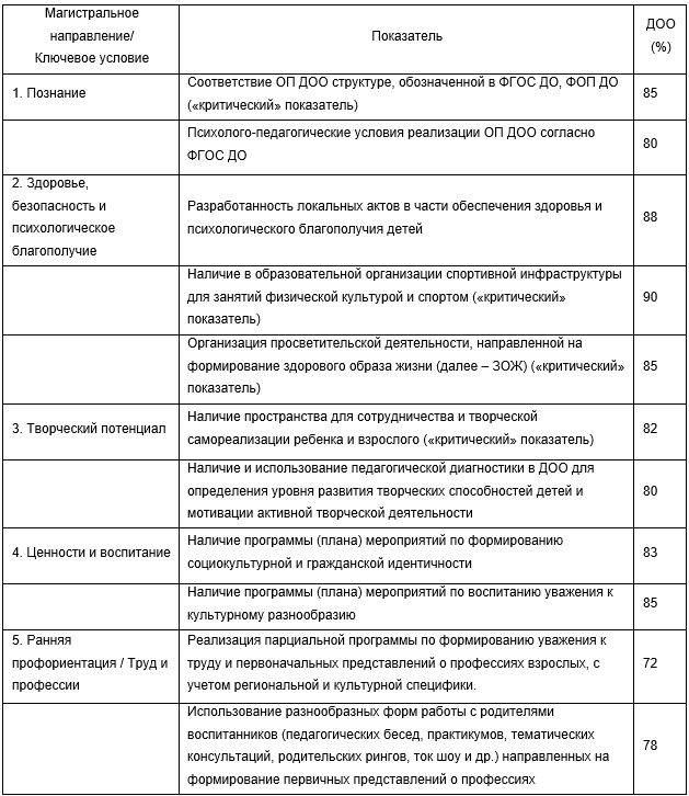 Система самодиагностики ДОО включает критерии и показатели, учитывающие специфику общеразвивающей, компенсирующей, оздоровительной, комбинированной направленностей, а также разновозрастных и групп детей раннего возраста. Общеразвивающие группы ориентированы на реализацию базовой программы дошкольного образования, компенсирующие — на адаптированные программы для детей с ограниченными возможностями здоровья с учетом их психофизических особенностей и потребностей, обеспечивающие коррекцию и социальную адаптацию. Оздоровительные группы предназначены для детей с хроническими заболеваниями, где наряду с образовательной программой реализуется комплекс лечебно-оздоровительных мероприятий. Комбинированные группы объединяют здоровых детей и детей с ОВЗ в условиях адаптированной образовательной среды. Разновозрастные группы включают воспитанников разного возраста, а группы раннего возраста обеспечивают присмотр и развитие детей от 2 месяцев до 3 лет без реализации формальной образовательной программы. Разработанная система самодиагностики направлена на комплексную оценку качества образовательного процесса и выявление направлений для совершенствования деятельности ДОО. В ходе апробации, проведённой на базе 150 дошкольных организаций Челябинской области различных типов, были проанализированы ключевые аспекты функционирования учреждений, а результаты представлены в процентном выражении. Полученные данные самодиагностики способствуют объективной оценке эффективности реализации образовательных программ и комплексного сопровождения воспитанников с учётом специфики каждой группы, что обеспечивает основу для принятия управленческих решений и повышения качества дошкольного образования. Таблица 2 Результаты самодиагностики ДОО по ключевым категориям (показатели высокого уровня)