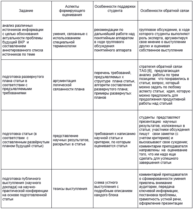 При организации формирующего оценивания и поддержки продуктивным средством развития готовности студента к самостоятельной оценке достигнутых результатов является рефлексивная диагностическая методика «Профайл развития профессиональных компетенций», разработанная И.Ю Гутник [7]. Заполнение профайла осуществляется студентом в начале и в конце семестра. Анализ профайла преподавателем позволяет выявить те зоны, которые являются проблемными и нуждаются в поддержке. Выявление динамики изменений позволяет ему осуществлять корректировку образовательного процесса и наблюдать за изменением глубины осмысления материала от поверхностного, фрагментарного, к более целостному анализу своих компетенций. При формирующем оценивании выполненных заданий важно обеспечить постоянную обратную связь посредством работы в форумах и чатах; в общении по электронной почте и др., что позволяет выявить трудности, которые возникают у студентов. Использование интернет-сервисов для организации формирующего оценивания дает ряд дополнительных возможностей [8]: