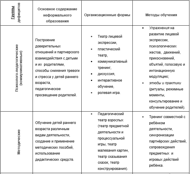 Abstract Key words: educators, shortages, methods, model, informal education, early childhood educators, community, forms. ---------------- В последние годы отмечается повышение интереса государственных и общественных структур к проблемам качества жизни и образования детей в возрасте от 2-х месяцев до 3-х лет. Исходя из этого, важно отметить, что одним из первых общественных взрослых, стоящим у истоков развития личности и олицетворяющим собой заботу государства о детях, выступает педагог раннего детства. Для большинства педагогов дошкольного профиля характерен полипрофессионализм. Процесс подготовки в колледжах и вузах ориентирует этих специалистов на работу с различными возрастными категориями детей, включая младенческий, ранний и дошкольный возраст. Такое положение, сложившееся в системе подготовки кадров в России и мире, не позволяет раскрыть всего богатства и разнообразия, особенного и единичного, что содержит в себе профессия педагога раннего детства. Несмотря на то, что эта профессия официально не закреплена в нормативных документах, в нашей стране такие педагоги представлены широким и неоднородным кругом специалистов, чья профессиональная деятельность напрямую связана с воспитанием, развитием и сопровождением маленьких детей, а именно: воспитатели групп раннего возраста, педагоги Службы ранней помощи, специалисты лекотеки, воспитатели Дома малютки, педагоги групп кратковременного пребывания детей, младшие воспитатели, няни. В нормативных документах и учебно-методической литературе четко определяется круг знаний, которыми должен овладеть педагог, работающий с детьми раннего возраста, а также перечень трудовых действий, ответственность, права и обязанности такого воспитателя [1]. Весьма конкретно представлены целевые ориентиры развития детей в возрасте 3-х лет. Вместе с тем, не овладев специфическим инструментарием, не открыв для себя характера взаимодействия с детьми младенческого и раннего возраста, такой педагог испытывает значительные трудности в работе с детьми, что может привести к эмоциональному выгоранию и депрофессионализации [2]. Условием, обеспечивающим выход из сложившейся ситуации, может стать неформальное образование, которое, в определенном качестве, предполагающем совместность, субъектность и личностный смысл процесса обучения, высокую степень самостоятельности, стремления педагогов к совершенству и самореализации, открывает педагогу раннего детства стратегии и способы образовательного взаимодействия с ребёнком, необходимые для поддержки ребёнка в условиях временной материнской депривации. Контент-анализ материалов исследований, проводимых нами в течении последних лет [3, 4], позволил нам выявить и классифицировать основные профессиональные дефициты, возникающие в деятельности педагогов, работающих с детьми раннего возраста. Представим детально каждую группу дефицитов, ранжировав по степени выраженности в оценке педагогов раннего детства. I группа профессиональных дефицитов – психолого-педагогические или коммуникативные. К таким дефицитам педагогов отнесены: неумение выстраивать раннюю коммуникацию с неговорящими детьми, скудность поведенческого репертуара, проблемы отслеживания и регулирования психоэмоционального состояния детей, а также трудности и барьеры общения с родителями воспитанников. II группа профессиональных деф