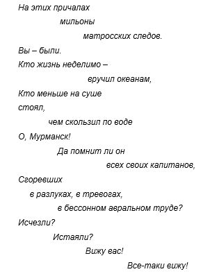 Блок 5. Подведение итогов. Формулировка авторской позиции. Стихотворение посвящено матросам и капитанам Тралфлота Мурманска. Мурманск, может, и не вспомнит всех своих «капитанов», но лирический герой В. Тимофеева их помнит, и исчезнут они не раньше, чем сам лирический герой. Стихотворение отличается наличием особой «романтики моря». В нем звучит различная лексика: от разговорной до высокой, используются фразеологизмы и устойчивые выражения, а также морская лексика, которая характерна для Кольского Севера. Разработанные нами задания по филологическому анализу региональных текстов прошли успешную апробацию. Практика показала, что их выполнение помогает школьникам осознать влияние культуры и истории своего края на язык, расширяет знания о малой родине, способствует обогащению словарного запаса региональной лексикой, позволяет формировать личность, которая гордится своим краем.