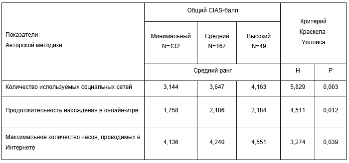 Статистический анализ достоверности с помощью критерия Краскела-Уоллиса показал, что по показателям «количество используемых социальных сетей», «продолжительность нахождения в онлайн-игре» и «максимальное количество часов, проводимых в Интернете» (p < 0.05) можно видеть, что с увеличением значения общего CIAS-балла, увеличиваются значения и по этим показателям. Это говорит о том, что данные показатели прямо свидетельствуют о степени погружения респондента в интернет-среду. Необходимо также отметить, что показатель «продолжительность нахождения в онлайн-игре» практически не отличается у групп со средней и высокой степенью погружения в интернет-среду. Для выявления различий личностных характеристик у юношей и девушек по исследуемым показателям был проведён t-тест Стьюдента для независимых выборок. Результаты, представленные в таблице 2, показали наличие значимых различий по ряду переменных (p < 0.05). Таблица 2 Достоверные различия средних значений показателей авторской методики и личностных характеристик у юношей и девушек с различной степенью погружения в интернет-среду
