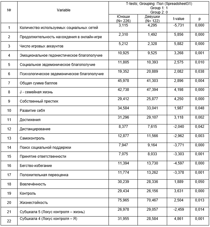 Как видно, у юношей достоверно выше показатели продолжительности нахождения в онлайн игре, а также число игровых аккаунтов. У девушек выше число используемых социальных сетей. Следовательно, более высокая степень погружения в интернет-среду у юношей характеризуется большим временем нахождения в онлайн-играх, а у девушек большим количеством страниц в социальных сетях. Что касается психологического благополучия, то у юношей более высокие показатели по эмоциональному гедонистическому и социальному эвдемоническому благополучию, а у девушек - по психологическому эвдемоническому благополучию. У юношей более высокий суммарный балл субъективного благополучия, из чего можно сделать вывод о том, что большая степень погружения в интернет-среду более пагубно сказывается на психологическом благополучии девушек. По показателям терминальных ценностей различия также присутствуют. У девушек более высокий показатель семейной жизни. У юношей же, более высокие показатели собственного престижа, развития себя и достижений. Это говорит о том, что более высокая степень погружения в виртуальное пространство сильнее сказывается отрицательным образом на ценностях семейной жизни у юношей. Более высокая степень погружения в интернет-среду отрицательно сказывается на стремлении к личностному развитию и достижениям, а также восприятию собственного престижа в обществе у девушек. Девушки с увеличением степени погружённости в интернет-пространство склонны прибегать к поиску социальной поддержки и бегству-избеганию. При этом, девушки чаще прибегают к положительной переоценке каких-либо негативных переживаний и принятию ответственности за свои действия. У юношей, с увеличением степени погружения в Интернет-среду, формируется тенденция к дистанцированию от жизненных неурядиц. Показатель самоконтроля у юношей оказался выше, чем у девушек. По показателям жизнейстойкости, также можно выделить достоверные различия у юношей и девушек. У юношей более высок показатель контроля и общего балла жизнестойкости, а у девушек более высокий показатель вовлеченности. Девушки продемонстрировали более высокие значения по показателю «Локус контроля – жизнь», что может отражать их склонность воспринимать свою жизнь как более упорядоченную и поддающуюся внешнему регулированию. В то же время юноши показали более высокие значения по показателю «Локус контроля – Я» , что свидетельствует о более выраженной вере в собственную способность влиять на события и достигать поставленных целей. По результатам проведенного исследования, можно сделать вывод о том, что степень погружения в интернет-среду по-разному влияет на личностные характеристики юношей и девушек. У юношей более глубокое вовлечение в виртуальное пространство чаще связано с онлайн-играми и сопровождается повышенными показателями субъективного благополучия, самоконтроля, жизнестойкости и ориентацией на собственные достижения и развитие. У девушек более высокая погружённость проявляется через активное использование социальных сетей и приводит к снижению психологического благополучия, изменению ценностных приоритетов и большей опоре на социальную поддержку и стратегии избегания. Кроме того, девушки демонстрируют более высокий внешний локус контроля, тогда как юноши — внутренний. Т