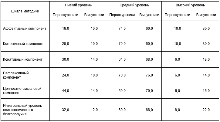 Все полученные эмпирические значения U – критерия Манна-Уитни находятся на уровне p≤0,05, но в соответствии с [7] принимается альтернативная гипотеза только при условии, что p≤0,01. Таким образом, статистически значимыми можно признать только различия по ценностно-смысловому компоненту и интегральному уровню психологического благополучия. Более низкий уровень психологического благополучия студентов-первокурсником можно объяснить незавершенностью периода адаптации к среде образовательной организации, учебному процессу, трудностями с выстраиванием отношений с однокашниками и преподавателями. Можно солидаризироваться с [6], что демонстрируют более высокий уровень психологического благополучия студенты, которые быстро интегрируются в новую среду, находят поддержку среди сверстников и преподавателей и лучше справляются с учебными нагрузками. Значимые различия в уровне ценностно-смыслового компонента психологического благополучия можно объяснить тем, что к окончанию обучения выпускники СПО более отчетливо видят свои перспективы как профессионалы, векторы развития в выбранной сфере, более уверены в своих компетенциях и их соответствии требованиям работодателей. При этом дальнейшего изучения требует вопрос, связанный с выявлением причин более низкого сдвига в остальных компонентах психологического благополучия. Автор заявляет об