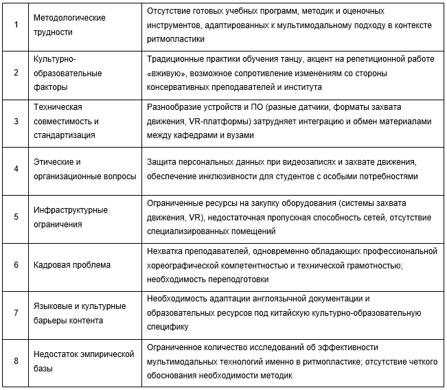 5.8.1. Чжэн Бисун Касиманова Людмила Альбертовна Мультимодальные технологии в преподавании ритмопластики как средство формирования общекультурной компетентности у студентов хореографических вузов Китая Аннотация Ключевые слова: мультимодальные технологии, преподавание ритмопластики, интеграция аудиовизуальных средств, формирование общекультурных компетенций, студенты-хореографы, интерактивные цифровые платформы, межкультурная коммуникация. ---------------- Zheng Bisong Lyudmila A. Kasimanovа Multimodal technologies in teaching rhythmic plasticity as a means of developing general cultural competencies in students of choreographic universities in China Abstract Ключевые слова: multimodal technologies, teaching rhythmic plasticity, integrating audiovisual resources, developing general cultural competencies, student choreographers, interactive digital platforms, intercultural communication. ---------------- Цифровая трансформация современного хореографического образования в Китае меняет условия формирования общекультурной компетентности. Для области танца это означает не только перенос традиционных практик в онлайн-пространство, но и переосмысление самой природы учебного процесса. Это переосмысление затрагивает не только методические приёмы, но и само отношение к телу как носителю культурного смысла: цифровая среда накладывает новые слои репрезентации движения, формируя слои данных, аудиовизуальных метадискурсов и тактильных сигналов, которые могут как обогащать, так и редуцировать живой опыт [1]. В этой ситуации мультимодальные технологии (которые понимаются нами в качестве средств, соединяющих несколько каналов восприятия: аудио (музыкальное сопровождение), видео (визуальная фиксация, анализ и реконструкция движения), тактильные интерфейсы (сенсоры, устройства обратной связи), пространственные модели (AR/VR) и интерактивные обучающие программы на базе ИИ), выступают не просто техническим инструментом, а педагогическим ресурсом, способным интегрировать различные каналы восприятия в процесс формирования общекультурной компетентности у обучающихся [2-4]. То есть в совокупности такого рода инструменты создают новый мультимодальный «пласт» педагогического поля [5], в котором учебный материал перестаёт быть только вербально и телесно передаваемым, а становится цифрово кодируемым, репрезентируемым и анализируемым. В контексте преподавания ритмопластики данные инструменты могут выступать в роли медиаторов между телесным опытом и цифровой репрезентацией, расширяя возможности формирования общекультурной компетентности и ориентируясь на интеграцию сенсорного опыта, смысловой рефлексии, когда тело становится одновременно инструментом выражения и объектом исследования [6; 7]. В такой парадигме важна не столько передача фиксированных техник, сколько создание условий для эксперимента с ритмом, пространством и телесной формой через комплексное использование мультимодальных технологий (например: внедрение анализа соответствия движений ритму с помощью датчиков и визуализации; VR-сценариев для освоения пространственных форм; интерактивных мультимедийных партитур, показывающих динамику акцентов и фразировки). При этом, как показывает практика [8-10], эффективность и оперативность внедрения подобных технологий в хореографические вузы Китая во многом обусловлены проблемами, которые отражают институциональные, педагогические, культурно-социальные и прочие факторы (см. таблица 1). Таблица 1 Проблемы внедрения м